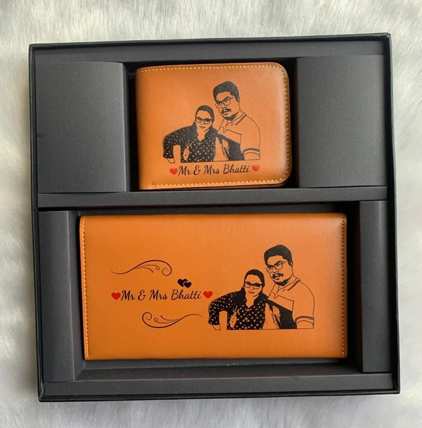 🔹Product : Printed couple combo Includes 1 men Sketch wallet 1 Ladies sketch MinimalClutch 🔹Scope of image Customised in sketch form. Comes in a box 📦 🔹Colors - Tan , Grey , Brown 🔹Dispatched on 3rd working day post payment